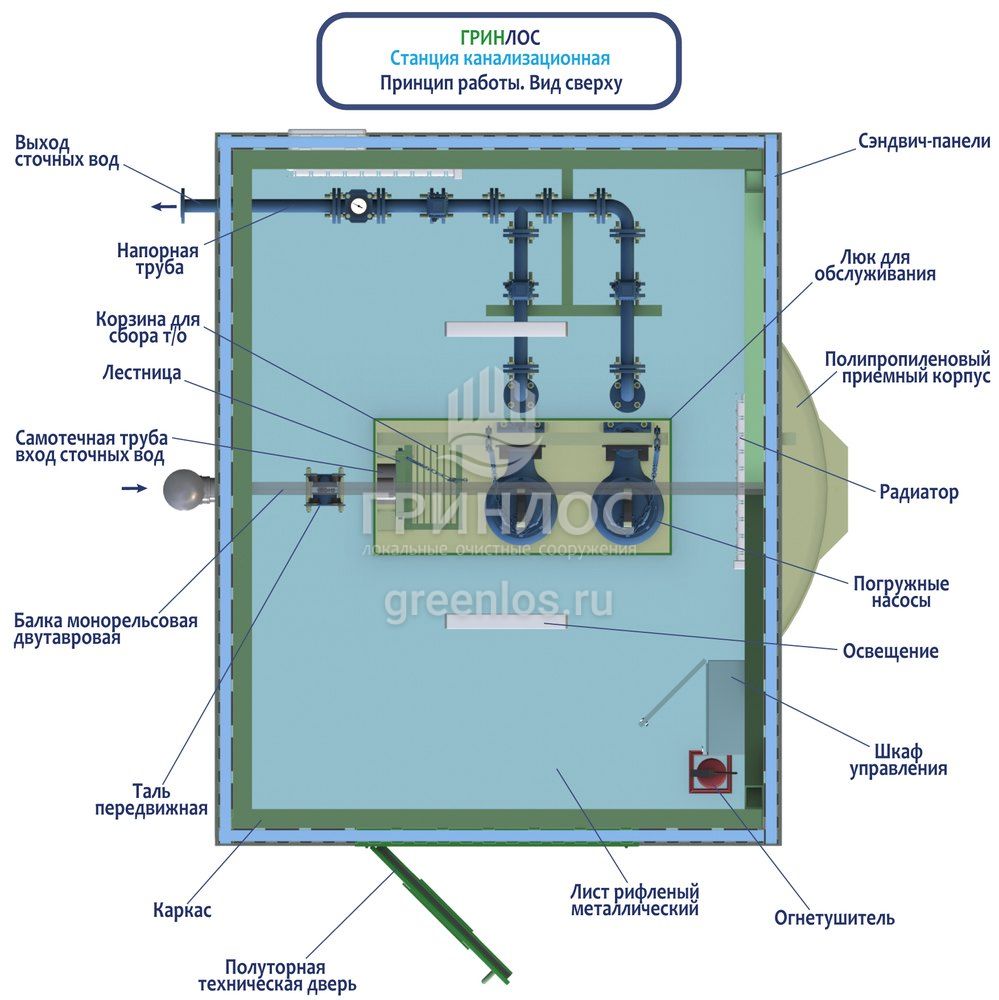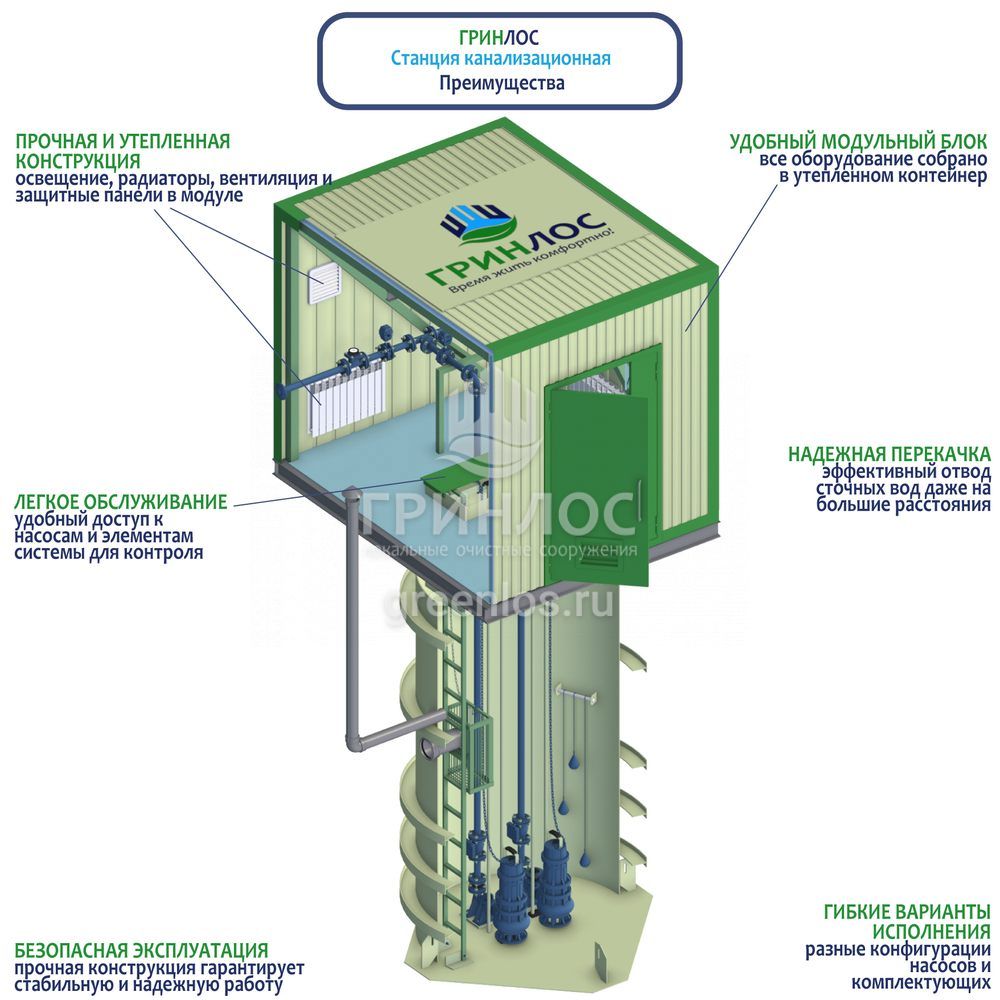Принцип работы блочно-модульной канализационной насосной станции Гринлос БМ КНС 100-120