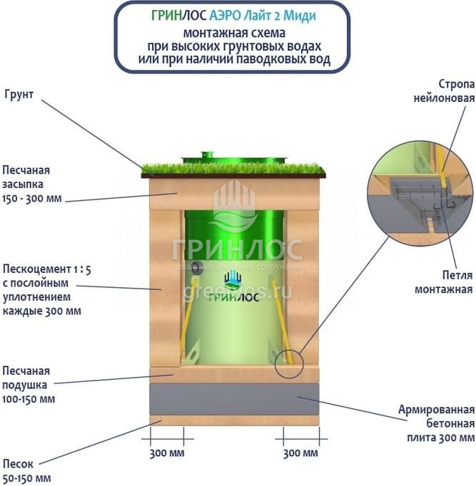 Станции очистки Гринлос Аэро Лайт 2 Миди обладают надежными грунтозацепами, действительно предотвращающими всплытие оборудования на обводненных участках.