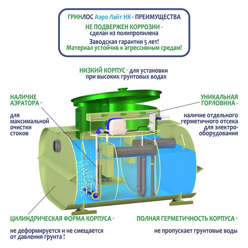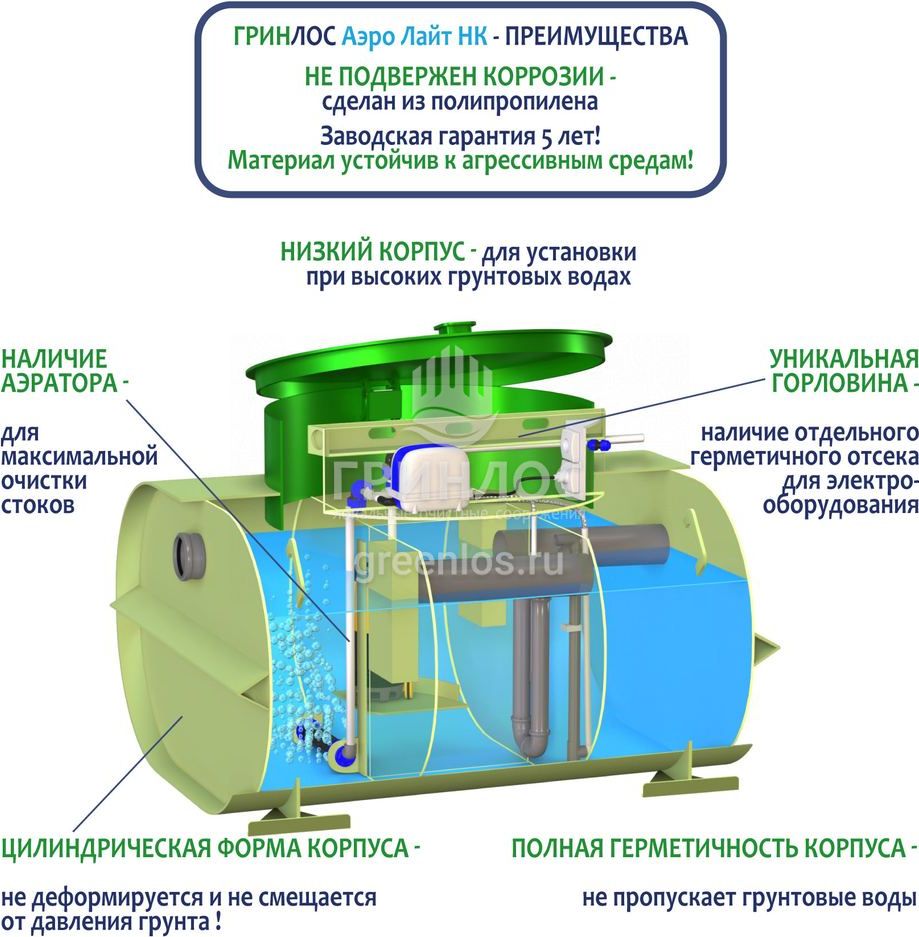 Отличительными особенностями септика Гринлос Аэро Лайт 3 Пр НК являются:
