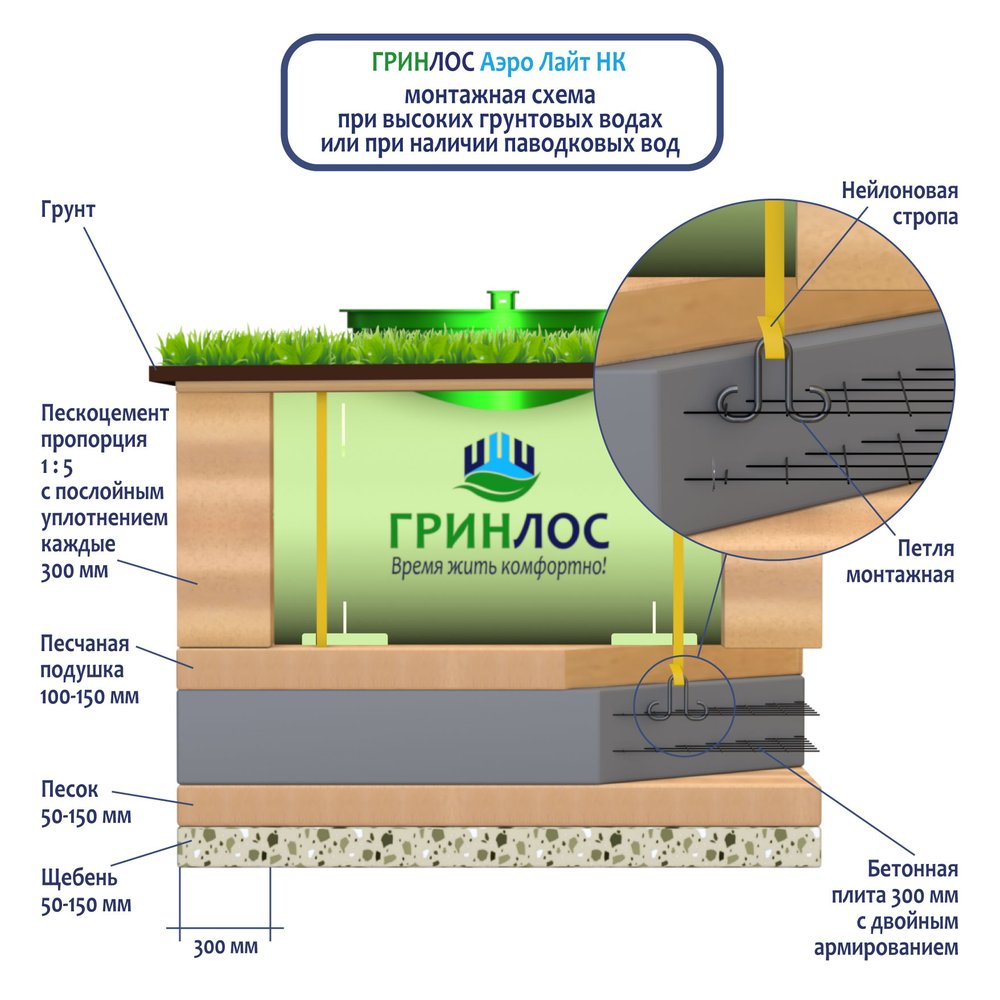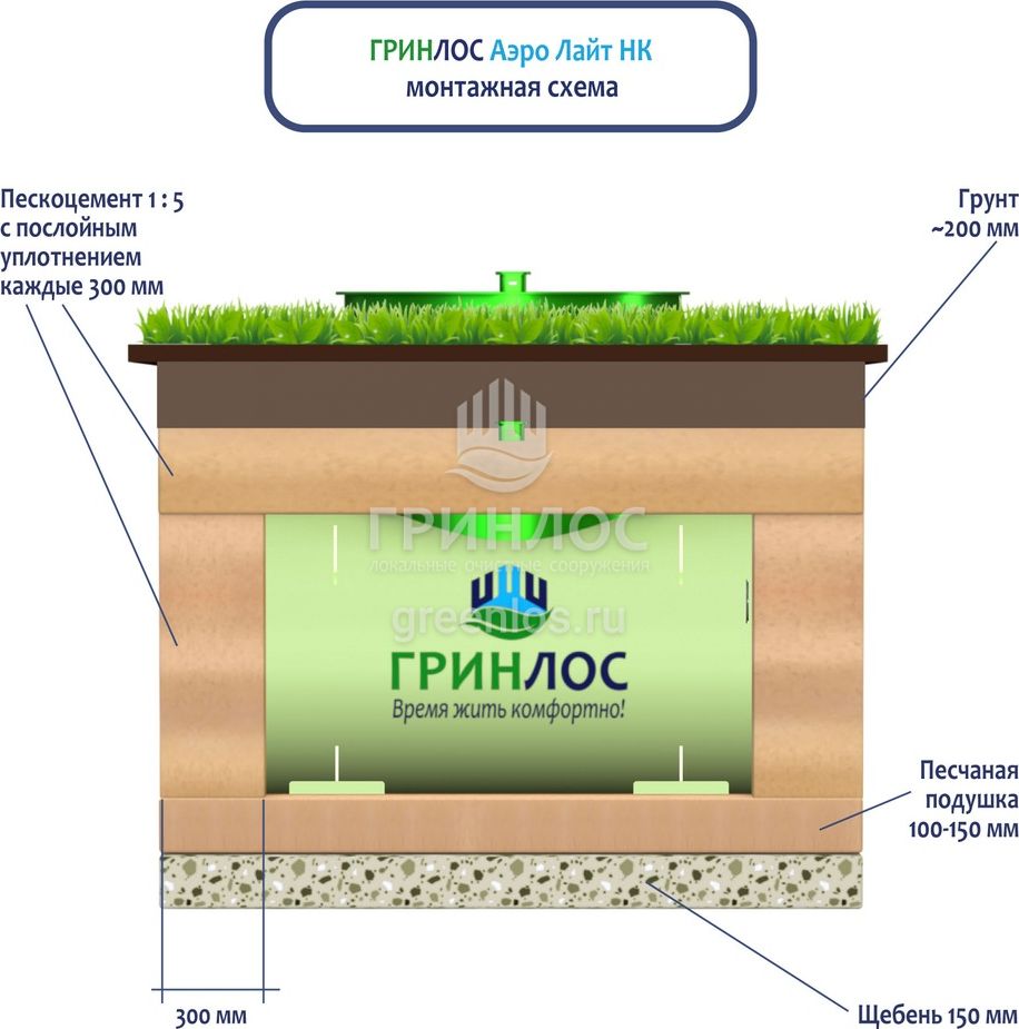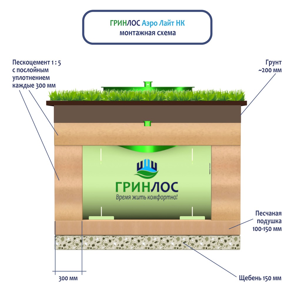 На верхнюю часть корпуса Гринлос Аэро Лайт Пр НК укладывается песчаная подушка высотой от 150 до 300 мм. Для подключения оборудования к внутренней канализационной системе используются специальные канализационные трубы, предназначенные для подобной эксплуатации.