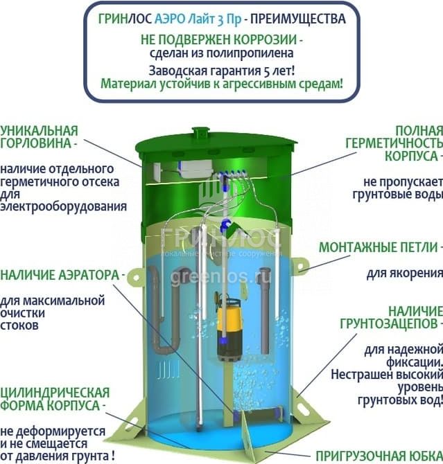 Отличительными особенностями септика Гринлос Аэро Лайт 3 Пр являются:
