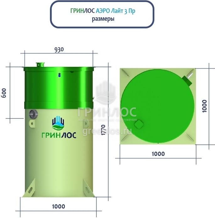 Высота корпуса Гринлос Аэро Лайт 3 Пр — 1.77 м, а врезка подводящей трубы осуществляется на глубине до 60 см. Станция подходит для монтажа во все виды почв: песок, глина, суглинок, грунты с высоким уровнем грунтовых вод.