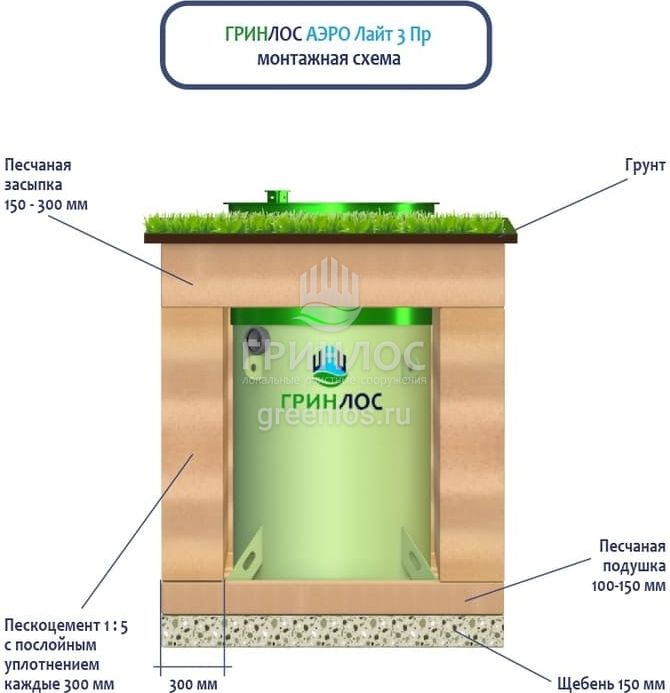 Поверх корпуса Гринлос Аэро Лайт 3 Пр выполняется песчаная обсыпка на высоту 150-300 мм. Для подсоединения оборудования к внутренней канализационной магистрали применяют канализационные трубы, предназначенные для эксплуатации.