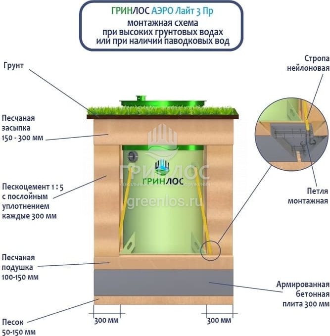 Станции очистки Гринлос Аэро Лайт 3 Пр обладают надежными грунтозацепами, действительно предотвращающими всплытие оборудования на обводненных участках.