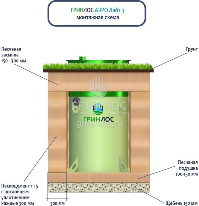 Поверх корпуса Гринлос Аэро Лайт 3 выполняется песчаная обсыпка на высоту 150-300 мм. Для подсоединения оборудования к внутренней канализационной магистрали применяют канализационные трубы, предназначенные для эксплуатации.
