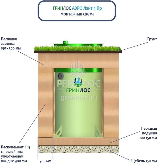 Поверх корпуса Гринлос Аэро Лайт 4 Пр выполняется песчаная обсыпка на высоту 150-300 мм. Для подсоединения оборудования к внутренней канализационной магистрали применяют канализационные трубы, предназначенные для эксплуатации.