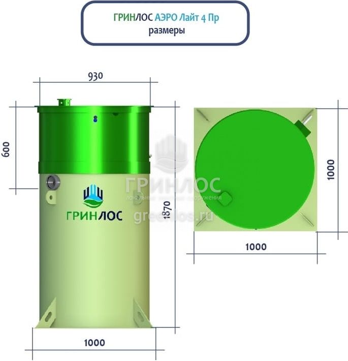 Высота корпуса Гринлос Аэро Лайт 4 Пр — 1.87 м, а врезка подводящей трубы осуществляется на глубине до 60 см. Станция подходит для монтажа во все виды почв: песок, глина, суглинок, грунты с высоким уровнем грунтовых вод.
