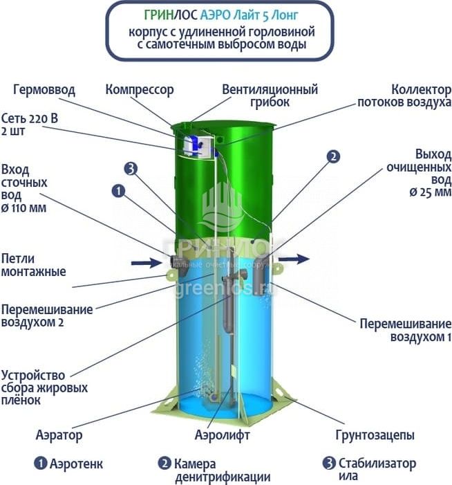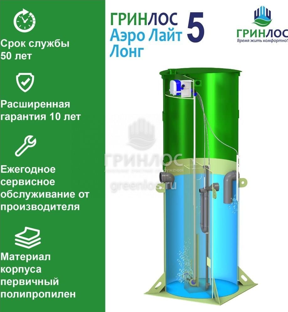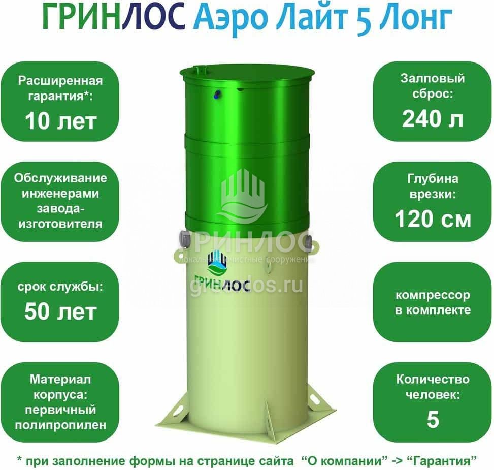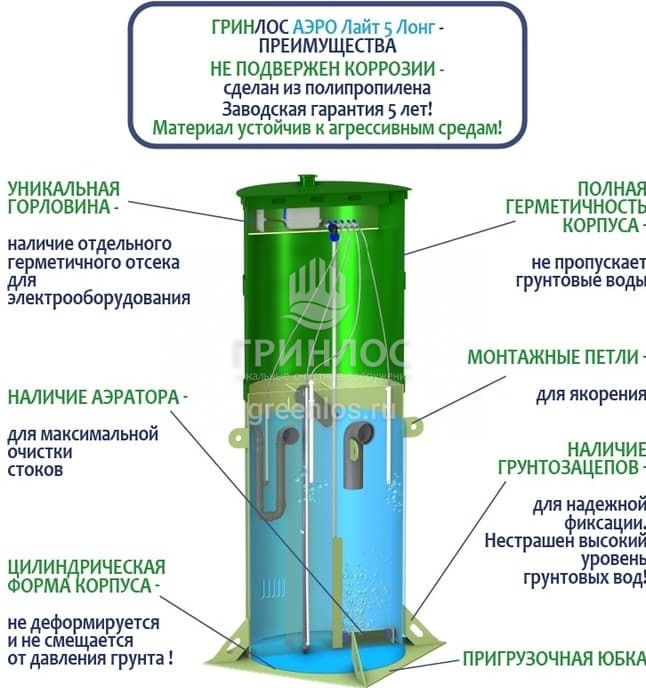 Отличительными особенностями септика Гринлос Аэро Лайт 5 Лонг являются:
