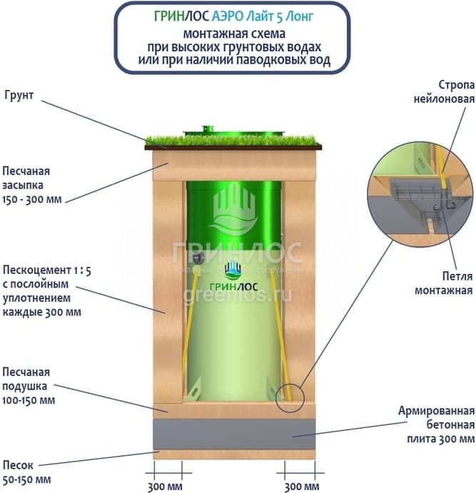 Перед непосредственным монтажом Гринлос Аэро Лайт 5 Лонг специалисты осуществляют подготовку котлована. Его размеры определяются конструктивными особенностями выбранной модели оборудования. Ознакомиться с данными параметрами можно в приложении к ПС.