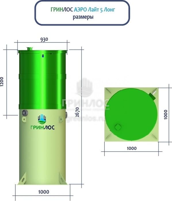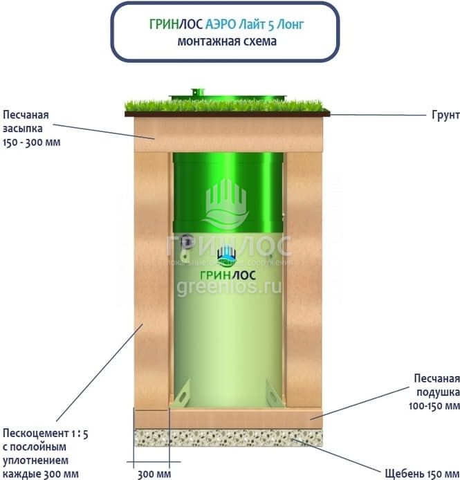 Высота корпуса Гринлос Аэро Лайт 5 Лонг — 2.67 м, а врезка подводящей трубы осуществляется на глубине до 120 см. Станция подходит для монтажа во все виды почв: песок, глина, суглинок, грунты с высоким уровнем грунтовых вод.
