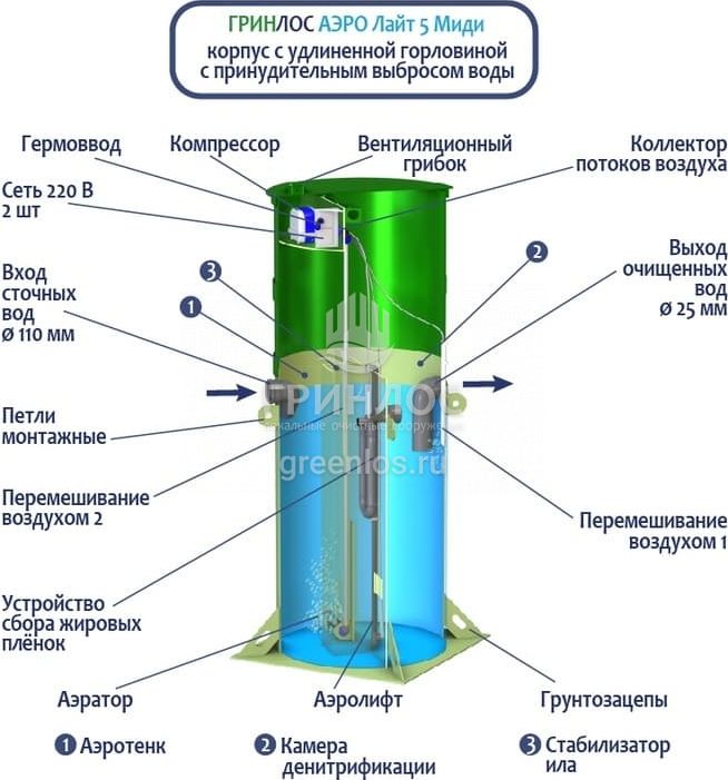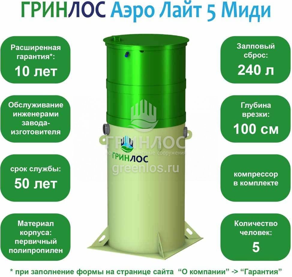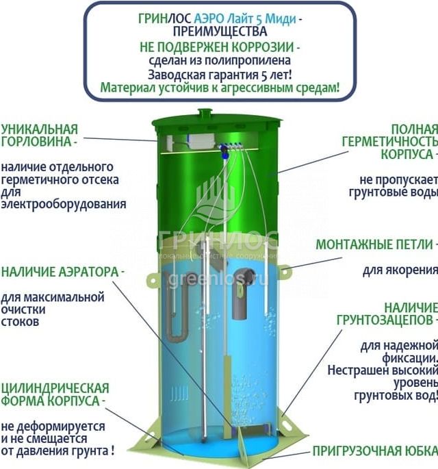 Отличительными особенностями септика Гринлос Аэро Лайт 5 Миди являются: