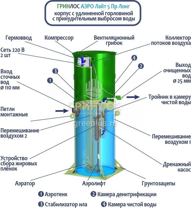 Станция Гринлос Аэро Лайт 5 Пр Лонг сконструирована таким образом, что все камеры, в которых происходит аэрация, разделение и осветление стоков объединены в одном корпусе цилиндрической формы.