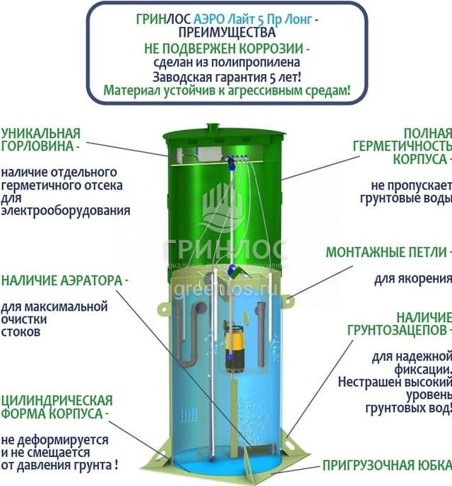 Отличительными особенностями септика Гринлос Аэро Лайт 5 Пр Лонг являются: