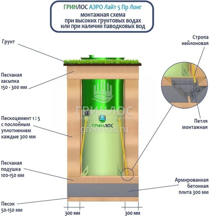 Перед непосредственным монтажом Гринлос Аэро Лайт 5 Пр Лонг специалисты осуществляют подготовку котлована. Его размеры определяются конструктивными особенностями выбранной модели оборудования. Ознакомиться с данными параметрами можно в приложении к ПС.