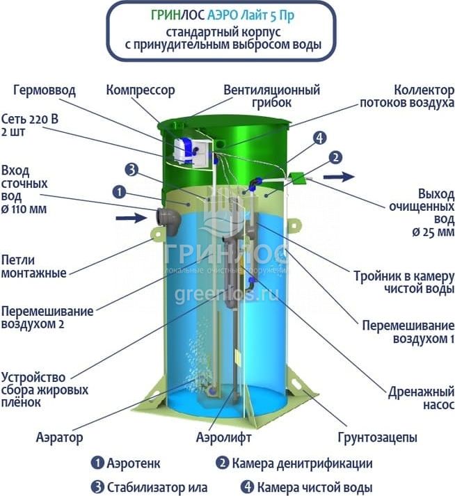 Станция Гринлос Аэро Лайт 5 Пр сконструирована таким образом, что все камеры, в которых происходит аэрация, разделение и осветление стоков объединены в одном корпусе цилиндрической формы.