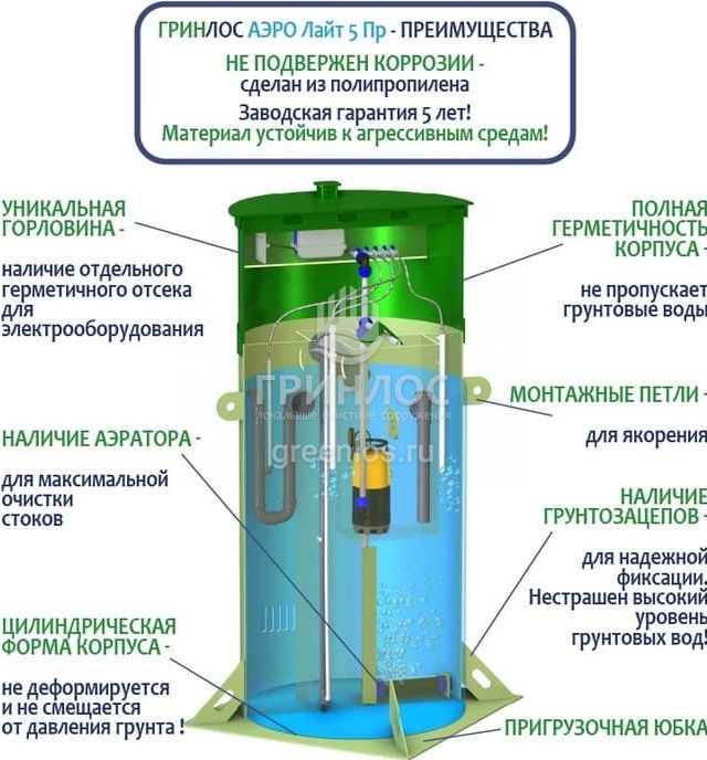 Отличительными особенностями септика Гринлос Аэро Лайт 5 Пр являются: