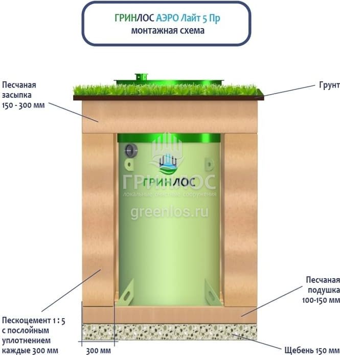 Поверх корпуса Гринлос Аэро Лайт 5 Пр выполняется песчаная обсыпка на высоту 150-300 мм. Для подсоединения оборудования к внутренней канализационной магистрали применяют канализационные трубы, предназначенные для эксплуатации.