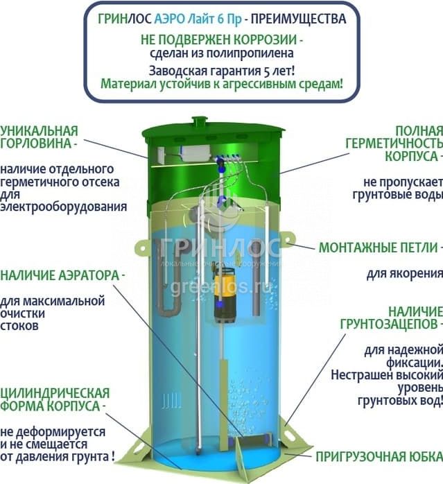 Отличительными особенностями септика Гринлос Аэро Лайт 6 Пр являются:
