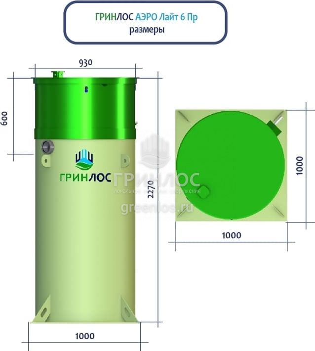 Высота корпуса Гринлос Аэро Лайт 6 Пр — 2.27 м, а врезка подводящей трубы осуществляется на глубине до 60 см. Станция подходит для монтажа во все виды почв: песок, глина, суглинок, грунты с высоким уровнем грунтовых вод.