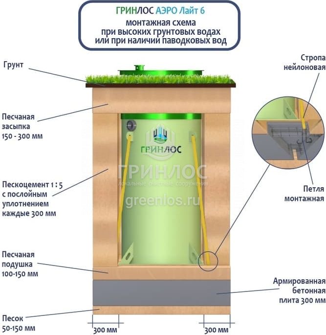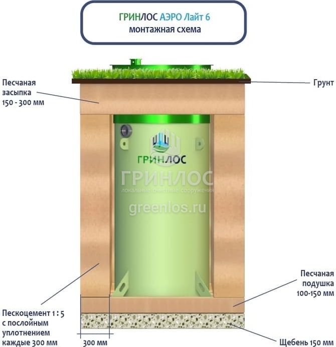 Высота корпуса Гринлос Аэро Лайт 6 — 2.27 м, а врезка подводящей трубы осуществляется на глубине до 60 см. Станция подходит для монтажа во все виды почв: песок, глина, суглинок, грунты с высоким уровнем грунтовых вод.