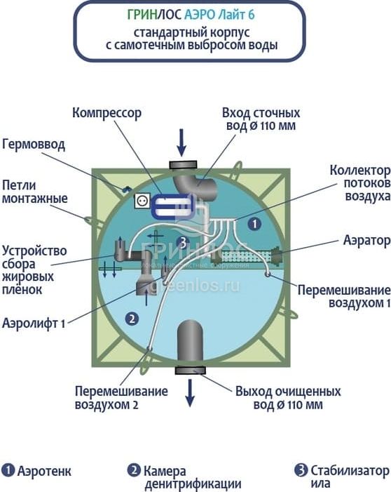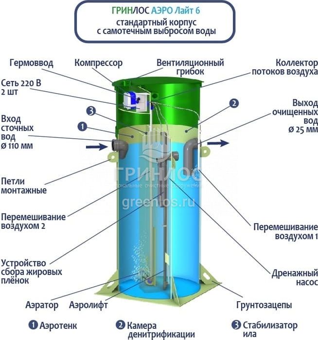 Станция Гринлос Аэро Лайт 6 сконструирована таким образом, что все камеры, в которых происходит аэрация, разделение и осветление стоков объединены в одном корпусе цилиндрической формы.