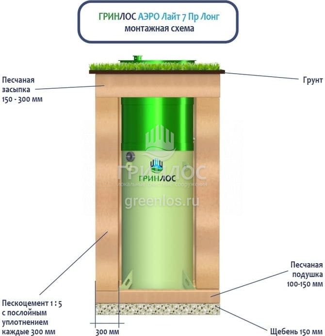 Высота корпуса Гринлос Аэро Лайт 7 Пр Лонг — 2.97 м, а врезка подводящей трубы осуществляется на глубине до 120 см. Станция подходит для монтажа во все виды почв: песок, глина, суглинок, грунты с высоким уровнем грунтовых вод.