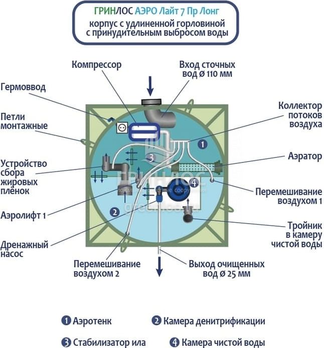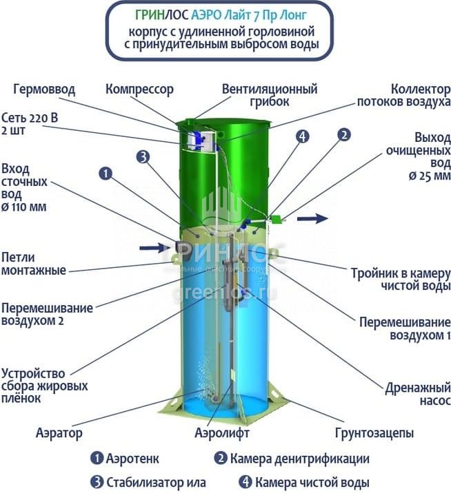 Станция Гринлос Аэро Лайт 7 Пр Лонг сконструирована таким образом, что все камеры, в которых происходит аэрация, разделение и осветление стоков объединены в одном корпусе цилиндрической формы.
