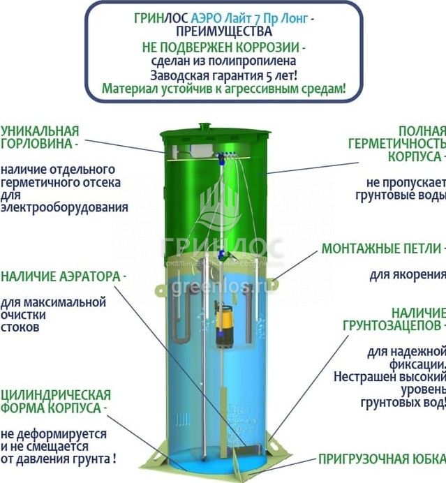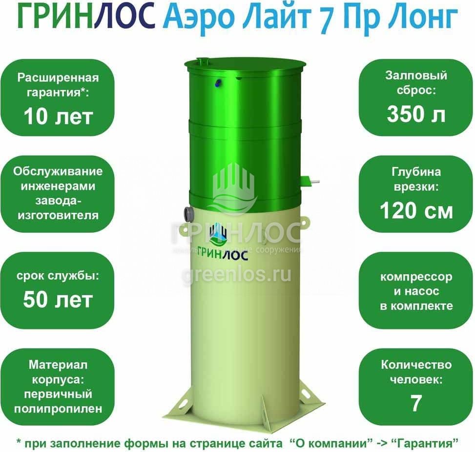 Отличительными особенностями септика Гринлос Аэро Лайт 7 Пр Лонг являются: