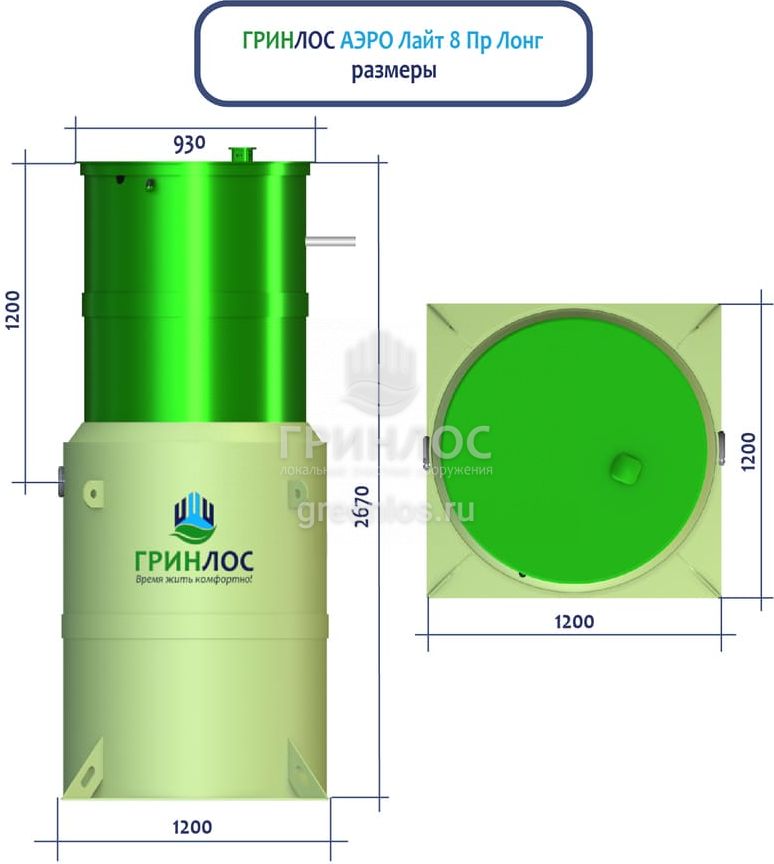 Высота корпуса Гринлос Аэро Лайт 8 ПР Лонг — 2.67 м, а врезка подводящей трубы осуществляется на глубине до 120 см. Станция подходит для монтажа во все виды почв: песок, глина, суглинок, грунты с высоким уровнем грунтовых вод.