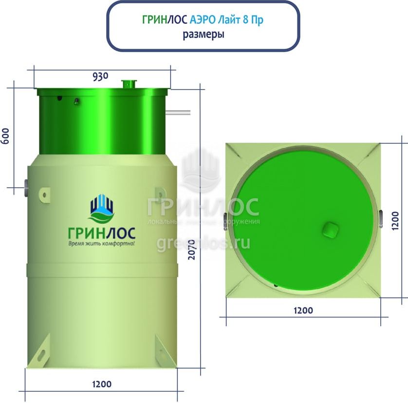Высота корпуса Гринлос Аэро Лайт 8 ПР — 2.07 м, а врезка подводящей трубы осуществляется на глубине до 60 см. Станция подходит для монтажа во все виды почв: песок, глина, суглинок, грунты с высоким уровнем грунтовых вод.