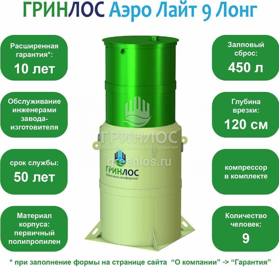 Отличительными особенностями септика Гринлос Аэро Лайт 9 Лонг являются: