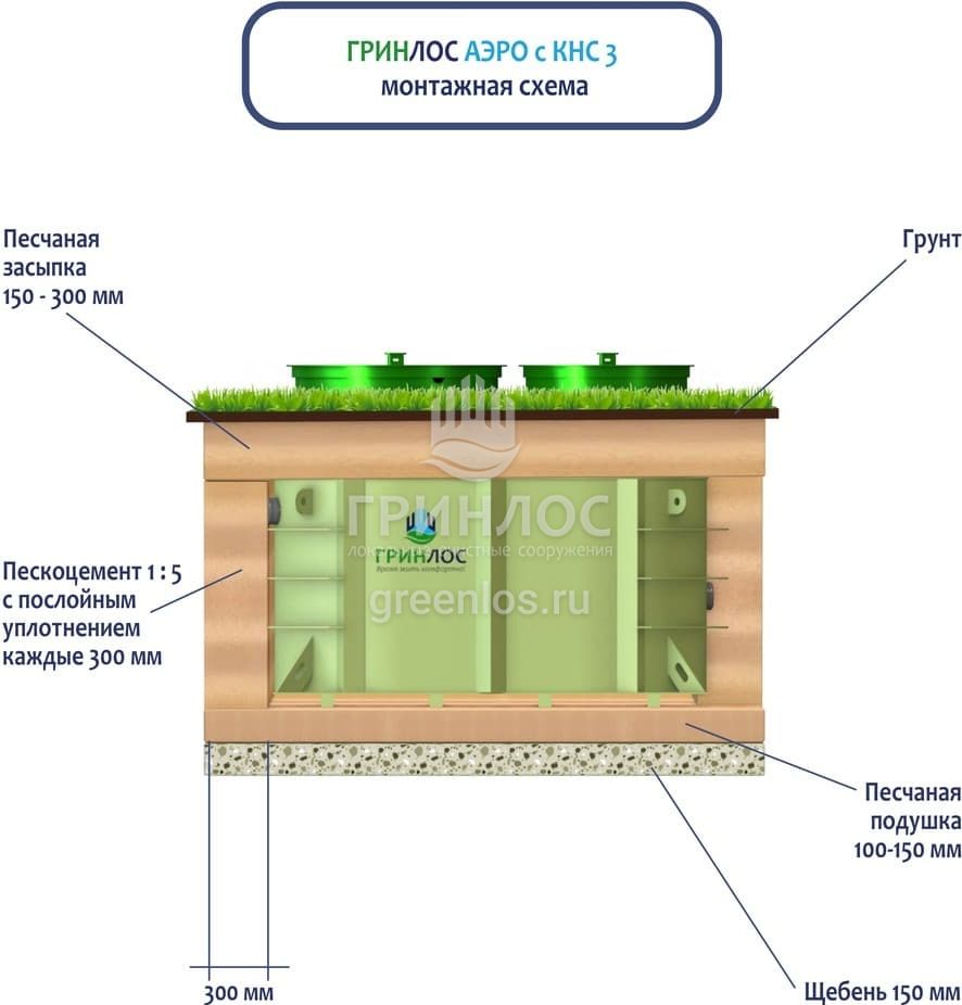 Поверх корпуса Гринлос Аэро с КНС 3 выполняется песчаная обсыпка на высоту 150-300 мм. Для подсоединения оборудования к внутренней канализационной магистрали применяют канализационные трубы, предназначенные для эксплуатации.