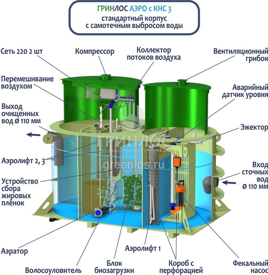 Конструкция Гринлос Аэро с КНС 3 специально разработана для участков, в которых нет возможности обустройства самотека канализационной трубы, а глубина врезки подводящей трубы ниже средней, а именно 100 см.