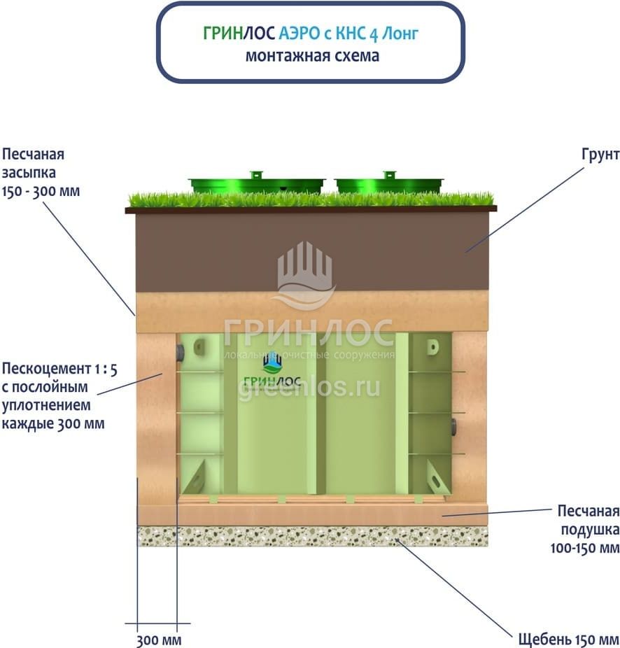 Перед непосредственным монтажом Гринлос Аэро с КНС 4 Лонг специалисты осуществляют подготовку котлована. Его размеры определяются конструктивными особенностями выбранной модели оборудования. Ознакомиться с данными параметрами можно в приложении к ПС.