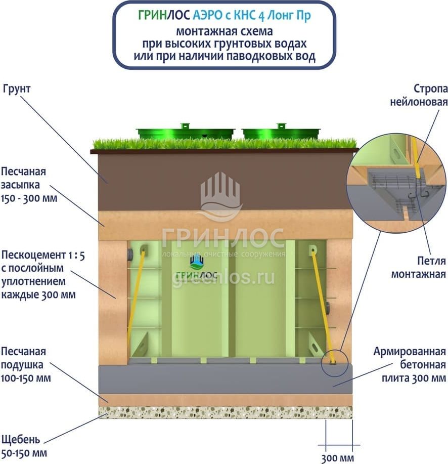 Перед непосредственным монтажом Гринлос Аэро с КНС 4 Пр Лонг специалисты осуществляют подготовку котлована. Его размеры определяются конструктивными особенностями выбранной модели оборудования. Ознакомиться с данными параметрами можно в приложении к ПС.