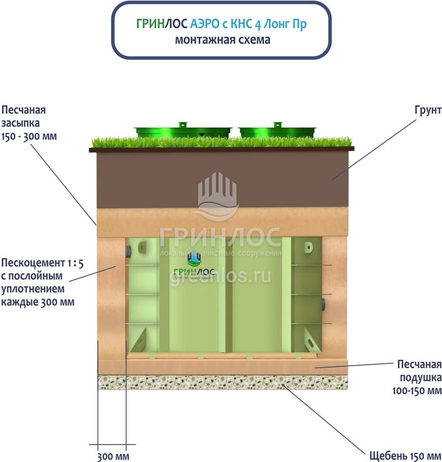 Поверх корпуса Гринлос Аэро с КНС 4 Пр Лонг выполняется песчаная обсыпка на высоту 150-300 мм. Для подсоединения оборудования к внутренней канализационной магистрали применяют канализационные трубы, предназначенные для эксплуатации.
