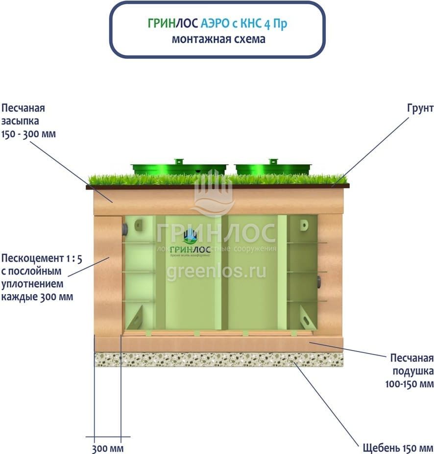 Поверх корпуса Гринлос Аэро с КНС 4 Пр выполняется песчаная обсыпка на высоту 150-300 мм. Для подсоединения оборудования к внутренней канализационной магистрали применяют канализационные трубы, предназначенные для эксплуатации.