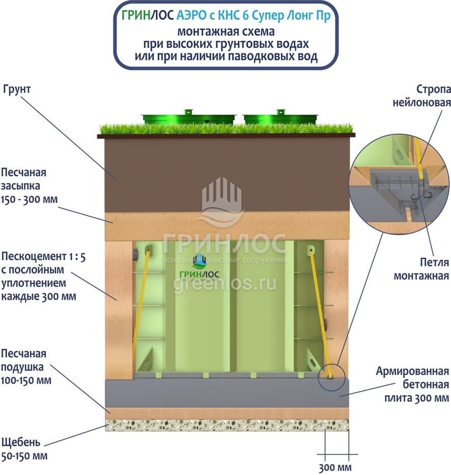 Перед непосредственным монтажом Гринлос Аэро с КНС 6 Пр Супер Лонг специалисты осуществляют подготовку котлована. Его размеры определяются конструктивными особенностями выбранной модели оборудования. Ознакомиться с данными параметрами можно в приложении к ПС.