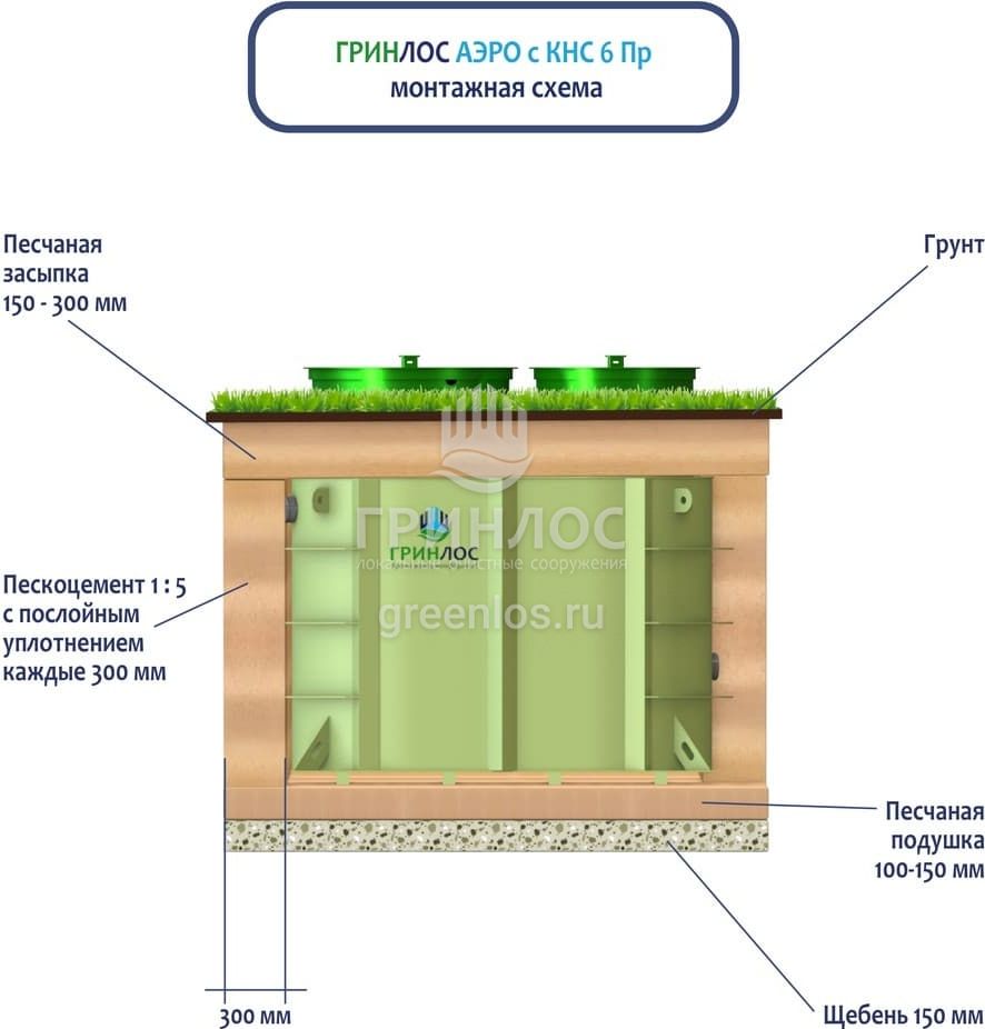 Поверх корпуса Гринлос Аэро с КНС 6 Пр выполняется песчаная обсыпка на высоту 150-300 мм. Для подсоединения оборудования к внутренней канализационной магистрали применяют канализационные трубы, предназначенные для эксплуатации.