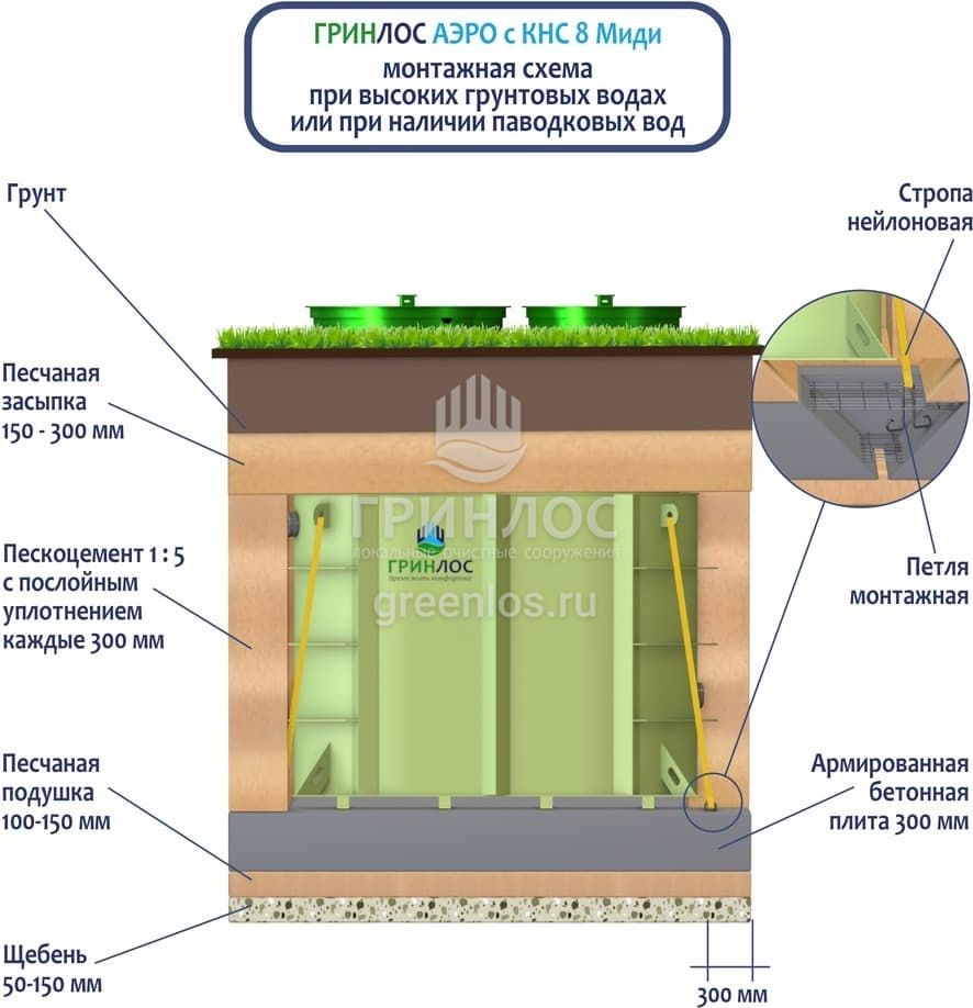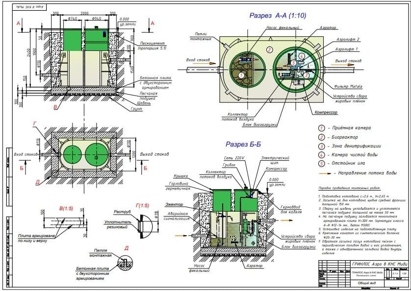 Перед непосредственным монтажом Гринлос Аэро с КНС 8 Миди специалисты осуществляют подготовку котлована. Его размеры определяются конструктивными особенностями выбранной модели оборудования. Ознакомиться с данными параметрами можно в приложении к ПС.