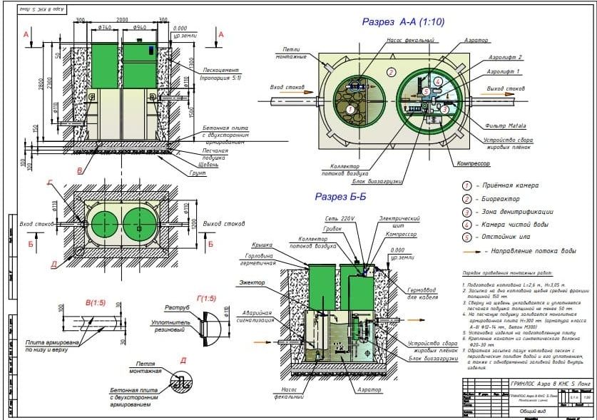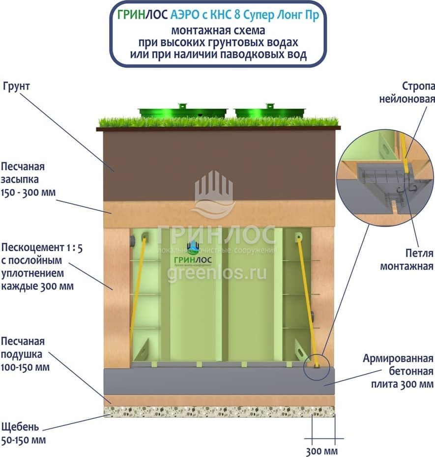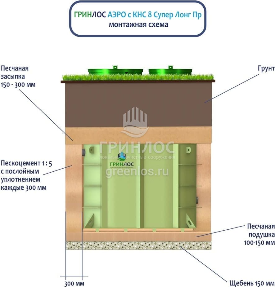 Перед непосредственным монтажом Гринлос Аэро с КНС 8 Пр Супер Лонг специалисты осуществляют подготовку котлована. Его размеры определяются конструктивными особенностями выбранной модели оборудования. Ознакомиться с данными параметрами можно в приложении к ПС.