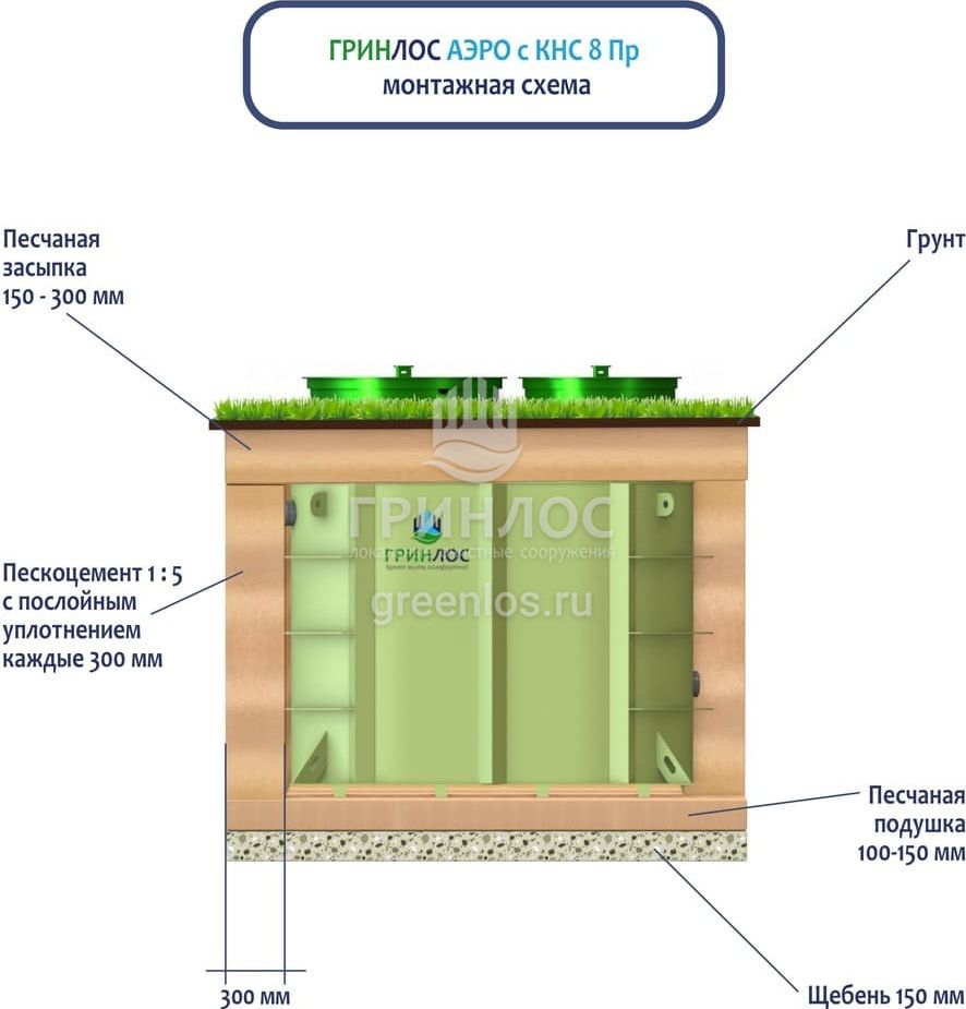 Поверх корпуса Гринлос Аэро с КНС 8 Пр выполняется песчаная обсыпка на высоту 150-300 мм. Для подсоединения оборудования к внутренней канализационной магистрали применяют канализационные трубы, предназначенные для эксплуатации.