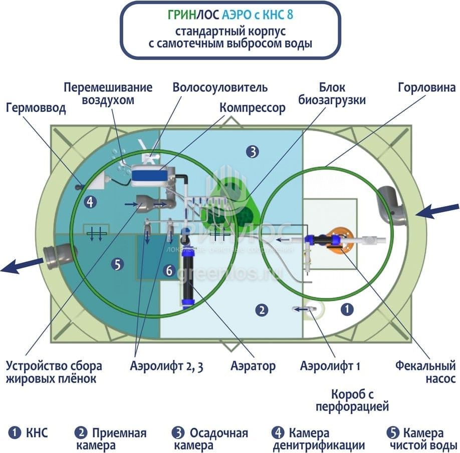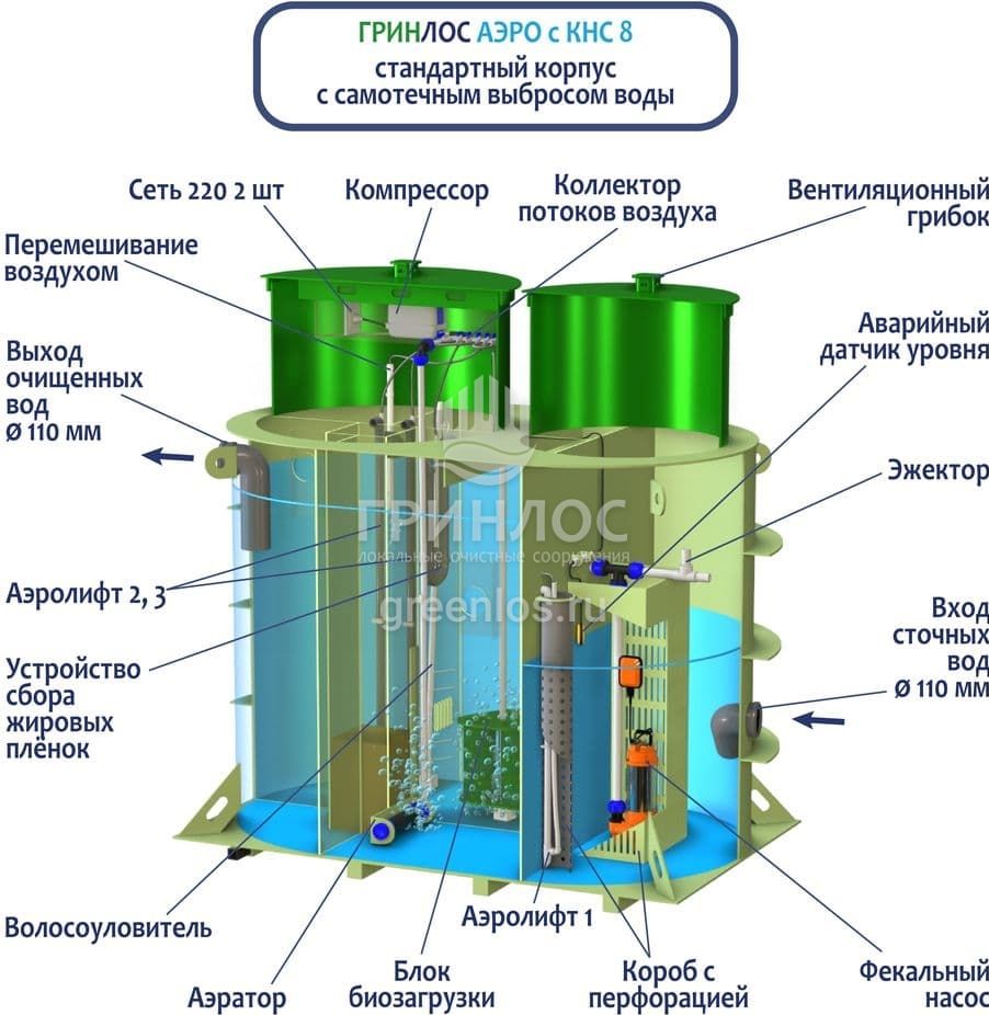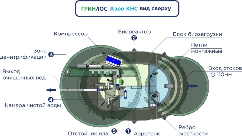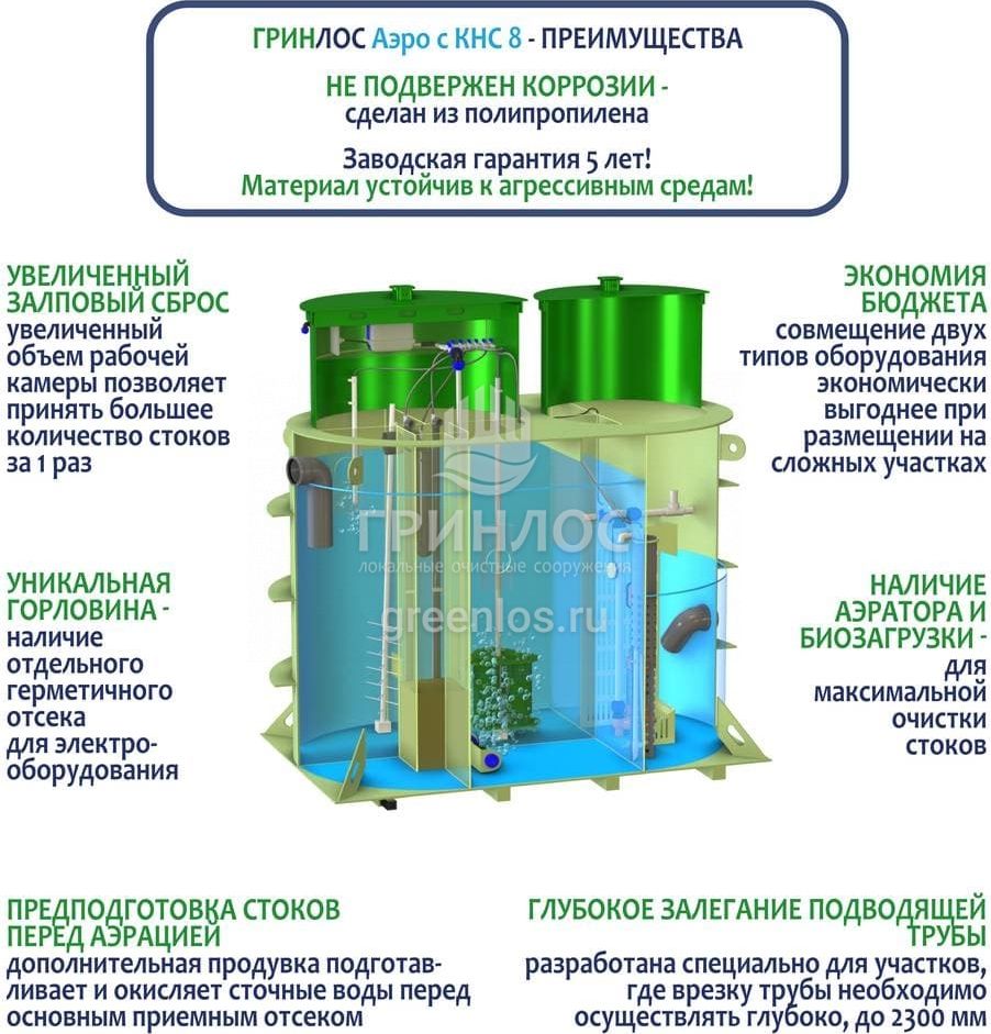 - применение в Гринлос Аэро с КНС 8 небольшого количества средств для чистки унитазов, санфаянса и кухонного оборудования.