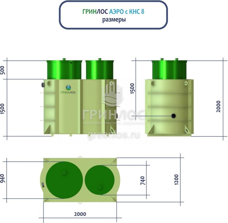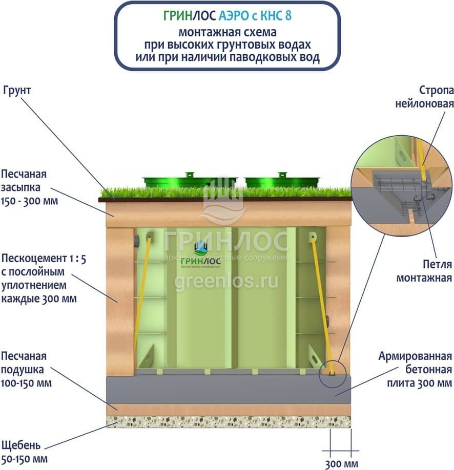 Конструкция Гринлос Аэро с КНС 8 специально разработана для участков, в которых нет возможности обустройства самотека канализационной трубы, а глубина врезки подводящей трубы ниже средней, а именно 150 см.