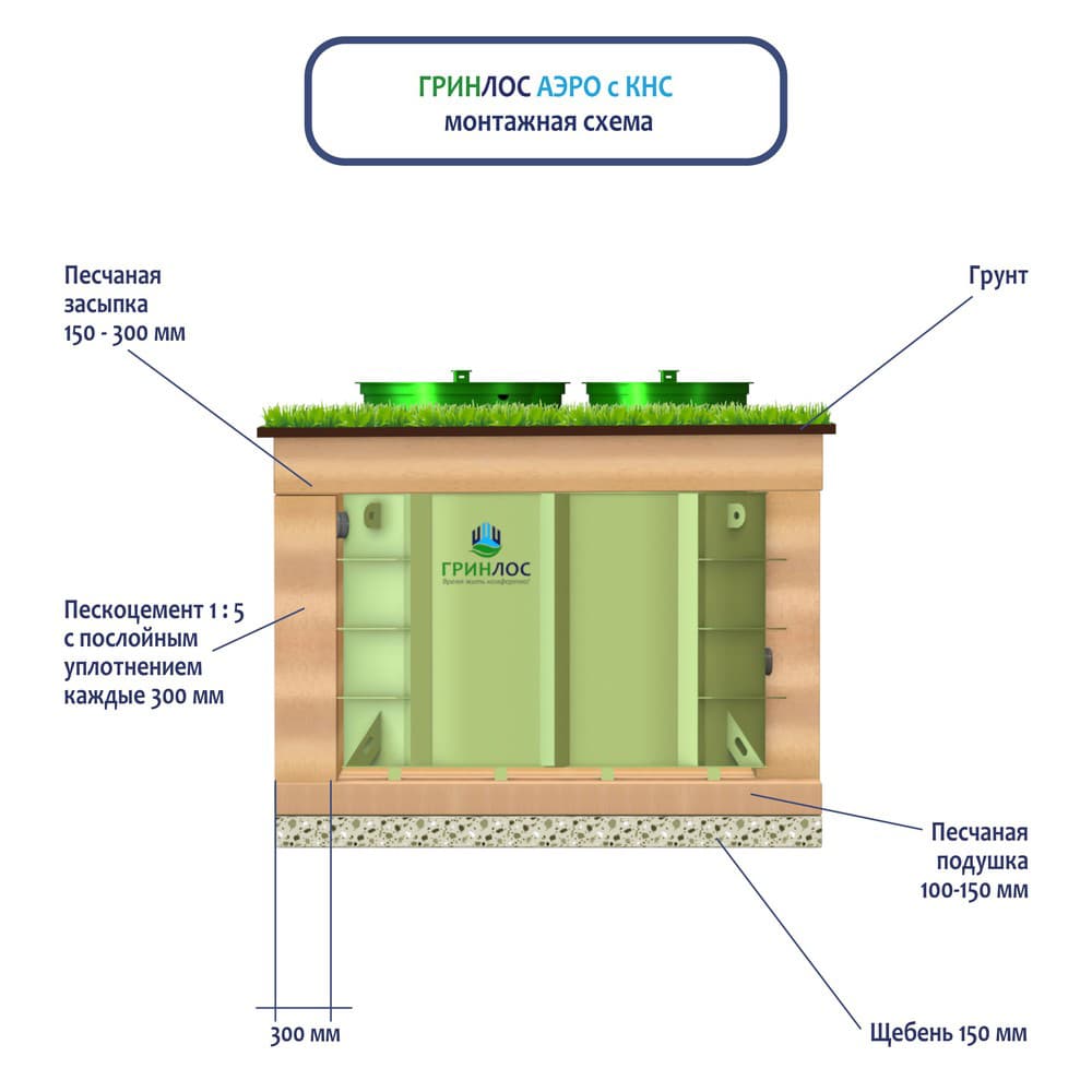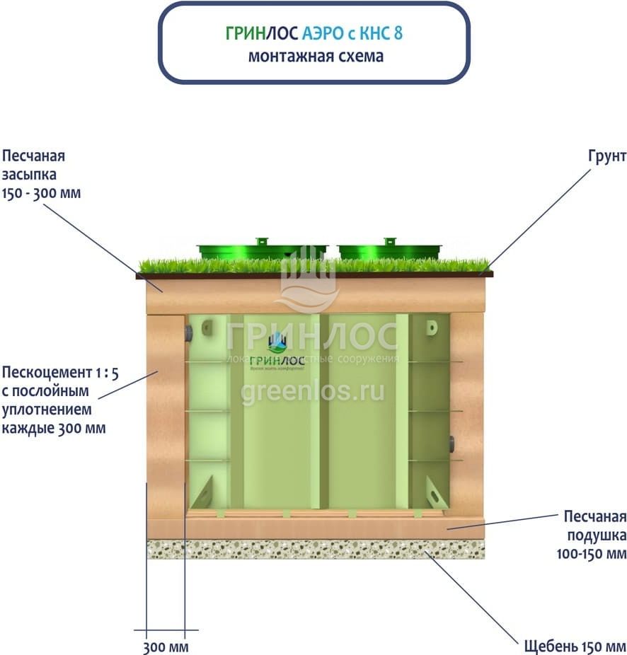 Поверх корпуса Гринлос Аэро с КНС 8 выполняется песчаная обсыпка на высоту 150-300 мм. Для подсоединения оборудования к внутренней канализационной магистрали применяют канализационные трубы, предназначенные для эксплуатации.