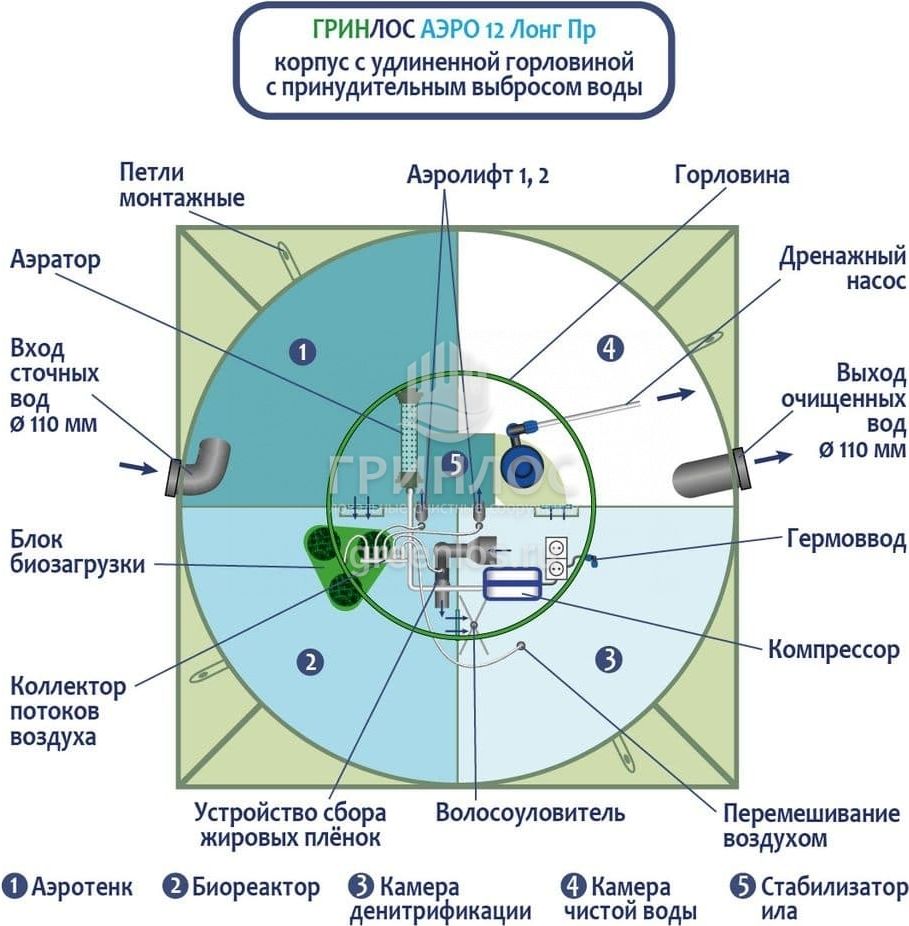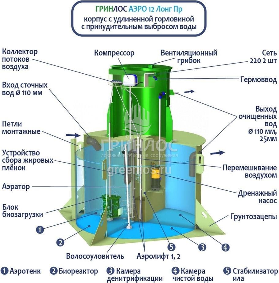 Станция ГРИНЛОС Аэро 12 Пр Лонг сконструирована таким образом, что все камеры, в которых происходит аэрация, разделение и осветление стоков объединены в одном корпусе цилиндрической или овальной формы.