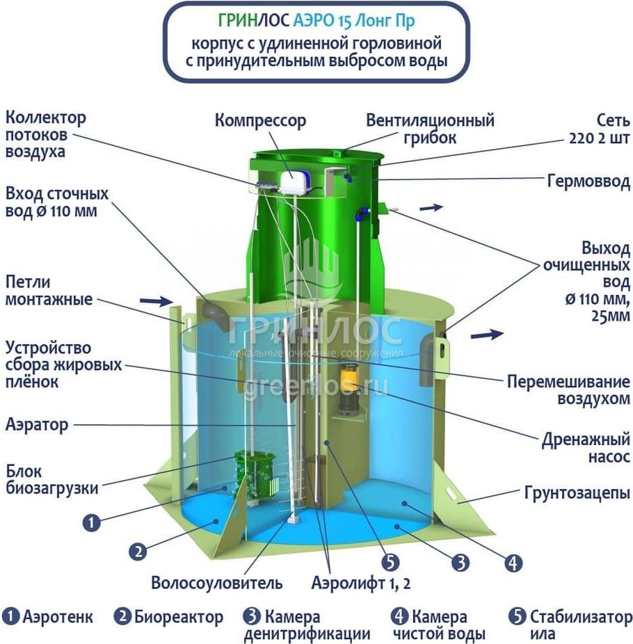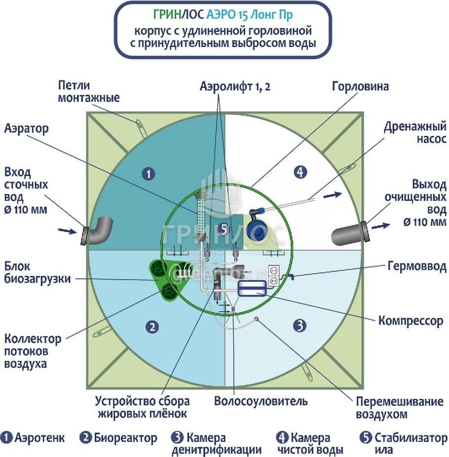 Станция ГРИНЛОС Аэро 15 Пр Лонг сконструирована таким образом, что все камеры, в которых происходит аэрация, разделение и осветление стоков объединены в одном корпусе цилиндрической или овальной формы.