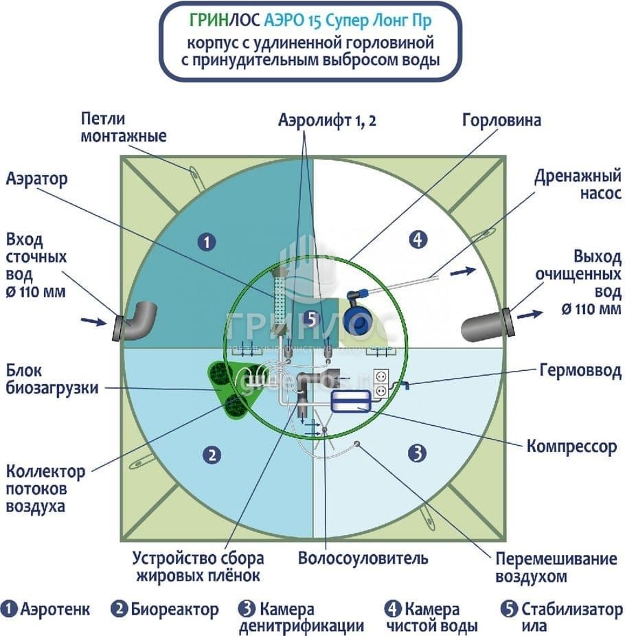 Естественный природный процесс в ГРИНЛОС Аэро 15 Пр Супер Лонг оптимизирован путем аэрации стоков и установки биофильтра (специального устройства, на котором образуется биопленка из микроорганизмов). Благодаря использованию двух видов ила – свободного и фиксированного, достигается более высокая степень очистки, удлиняется временной интервал планового обслуживания.