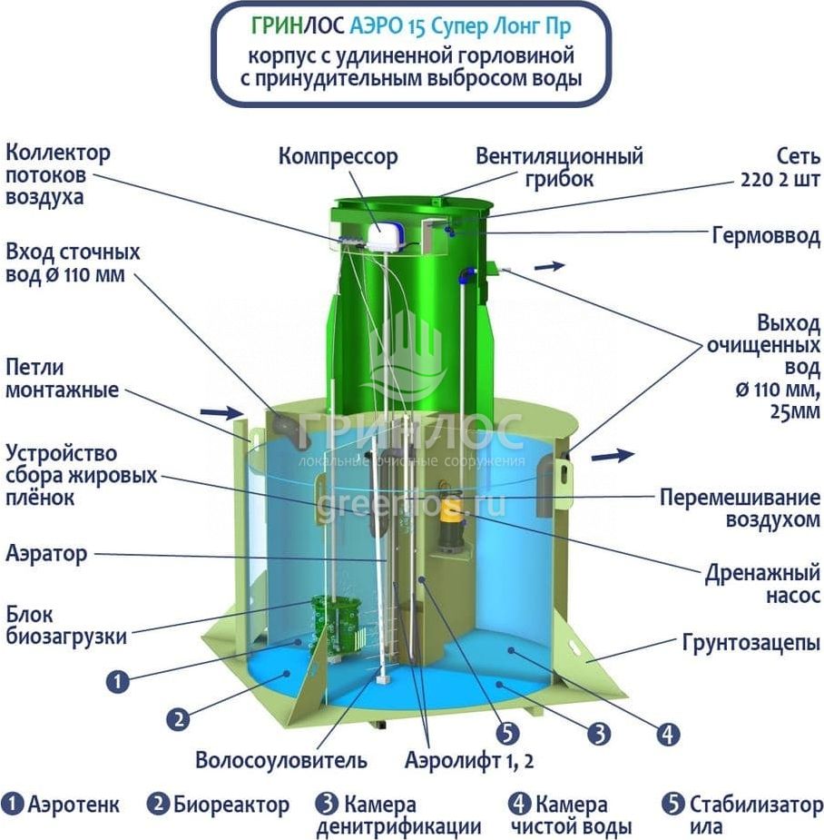 Станции биологической очистки ГРИНЛОС Аэро 15 Пр Супер Лонг предназначены для расщепления и переработки основных органических загрязнений, содержащихся в бытовых сточных водах. Эти процессы происходят в результате жизнедеятельности аэробных микроорганизмов, условия для жизнедеятельности которых создает ЛОС.