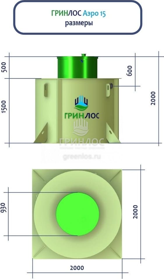 ГРИНЛОС Аэро 15 — это самотечная модель аэрационной установки биологической очистки с залповым сбросом 1100 л и производительностью 3 м3/сутки, что делает его подходящим для домов, в которых число жильцов не превышает 15 условных пользователей.